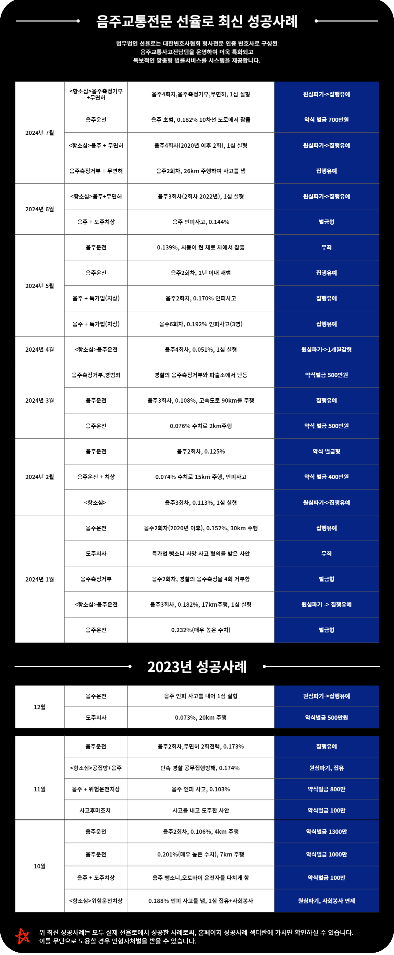 사이트 메인과 성공사례 페이지는 음주운전, 음주교통사고, 측정거부, 반복 적발 사건을 유형별로 분류해 두고 있고, 최근 사례 목록에서도 음주 2회차, 음주 3회차, 음주교통사고, 도주치상까지 세부적으로 나누어 보여 주고 있습니다. 서울음주운전변호사, 강남음주운전변호사, 서초음주운전변호사 키워드로 접근하는 사람 입장에서는 이런 방식이 의미가 있습니다. 내 사건이 어디에 가까운지 먼저 가늠해 볼 수 있기 때문입니다.
